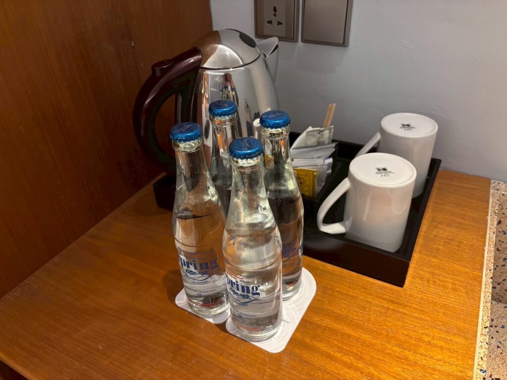 無料の水も4本付いてきます。コーヒーは、パックタイプのものでした。