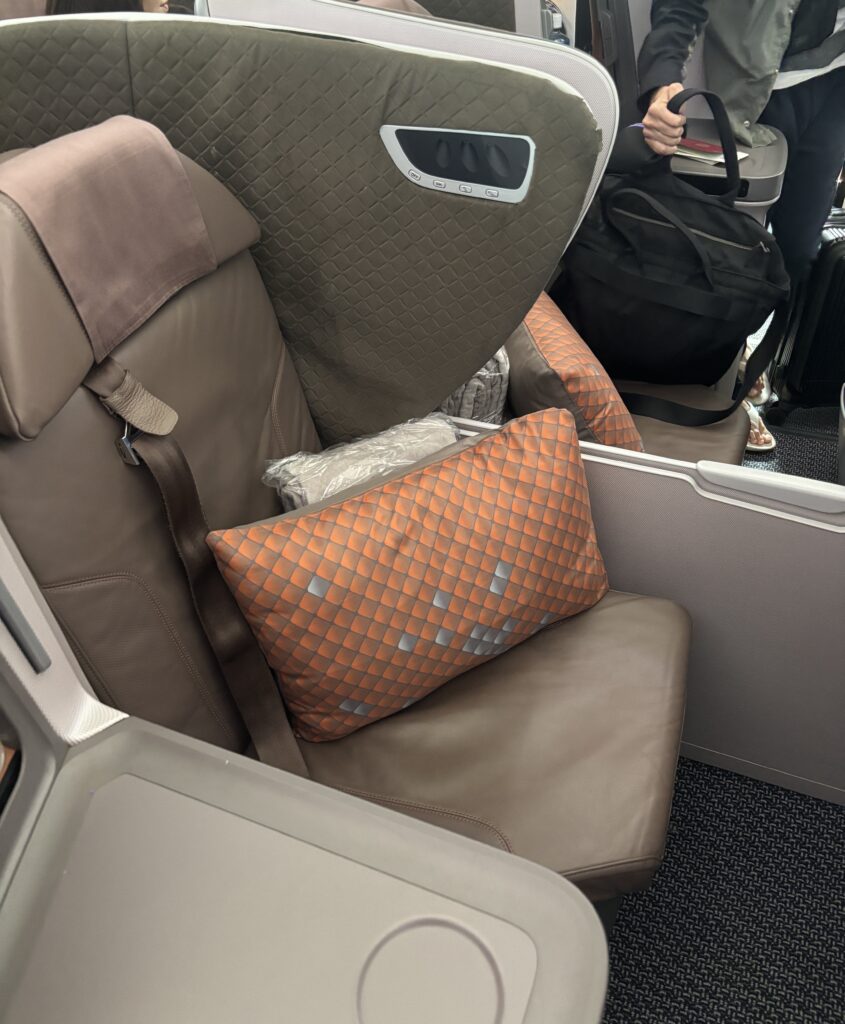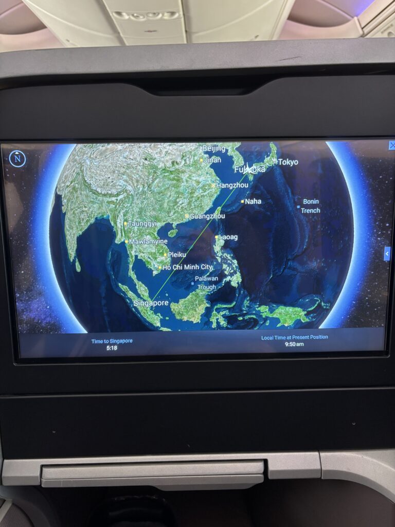 シートは、フルフラット仕様になっており、足を伸ばしてゆっくりくつろげます。足元のスペースは、すごく広いというわけではないですが、シンガポールまで6時間のフライトだとこれで全然十分。