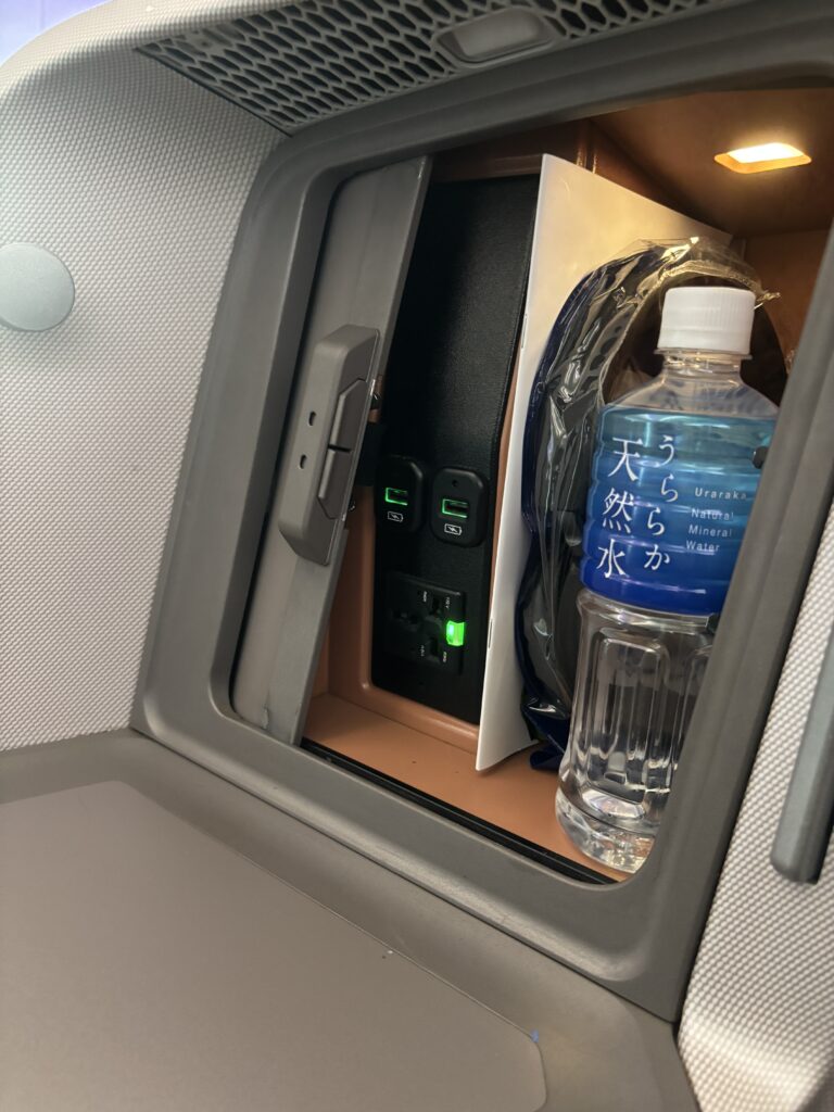 当日搭乗した機材はB787機。座席の横幅は、約86cmと業界最大級となっているそう。完全に個室空間というわけではありませんが、仕切りがきちんとあるため、他の乗客と視線が合わない設計になっています。