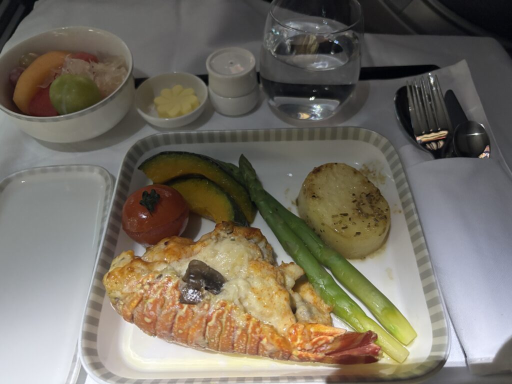 正直最初は、機内食で食べるロブスターって身が少ないだろうし微妙だろうなと思っていたのですが、身は詰まっているし、食感もブリッブリで感動しました。