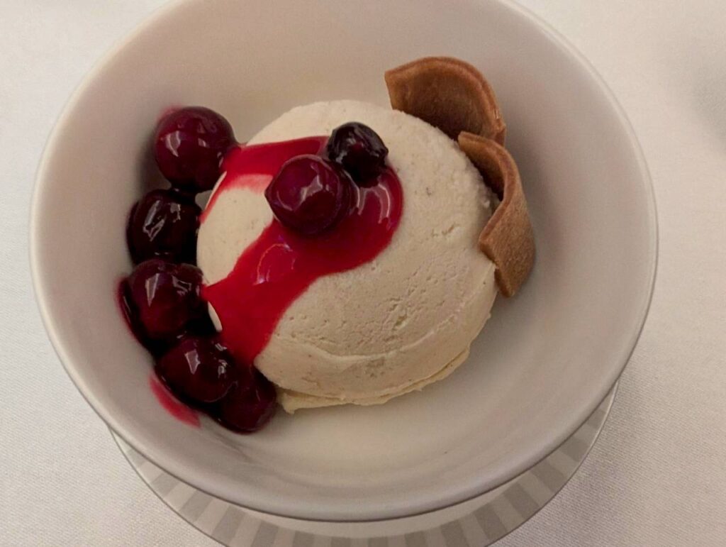 食後はアイスがでてきました。焼いた八ツ橋が添えられており、細部までこだわりを感じる機内食でした。