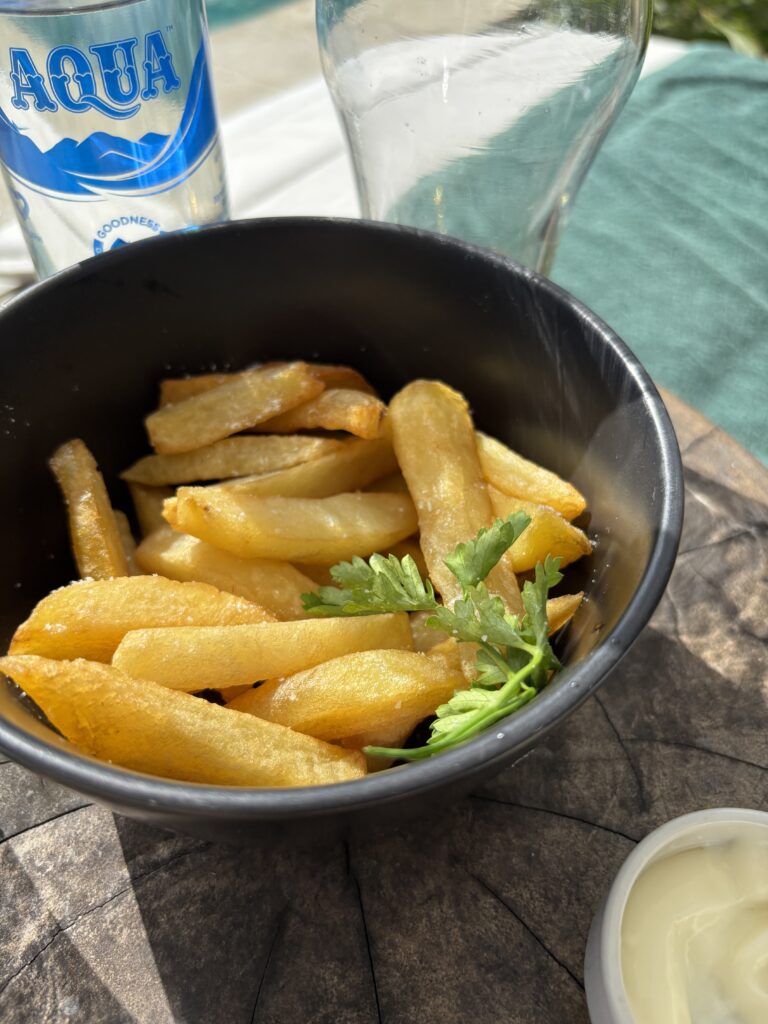 フードもオーダーできます。このフライドポテト、アイオリソースにディップして食べたら美味しかった。高級ホテルのプールサイドでフードを注文すると、ミニマム1,000円はかかりますが、ここは500円くらいでオーダーできました。
