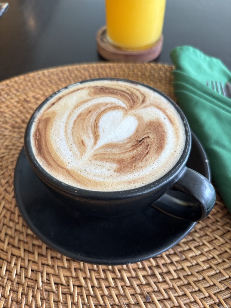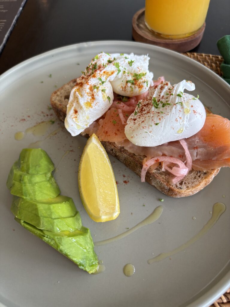 ご飯1品にジュースとコーヒーがつきます。私は、スモークサーモン、オレンジジュース、オーツミルクラテをオーダー。