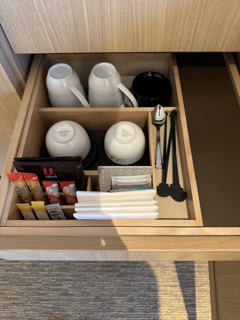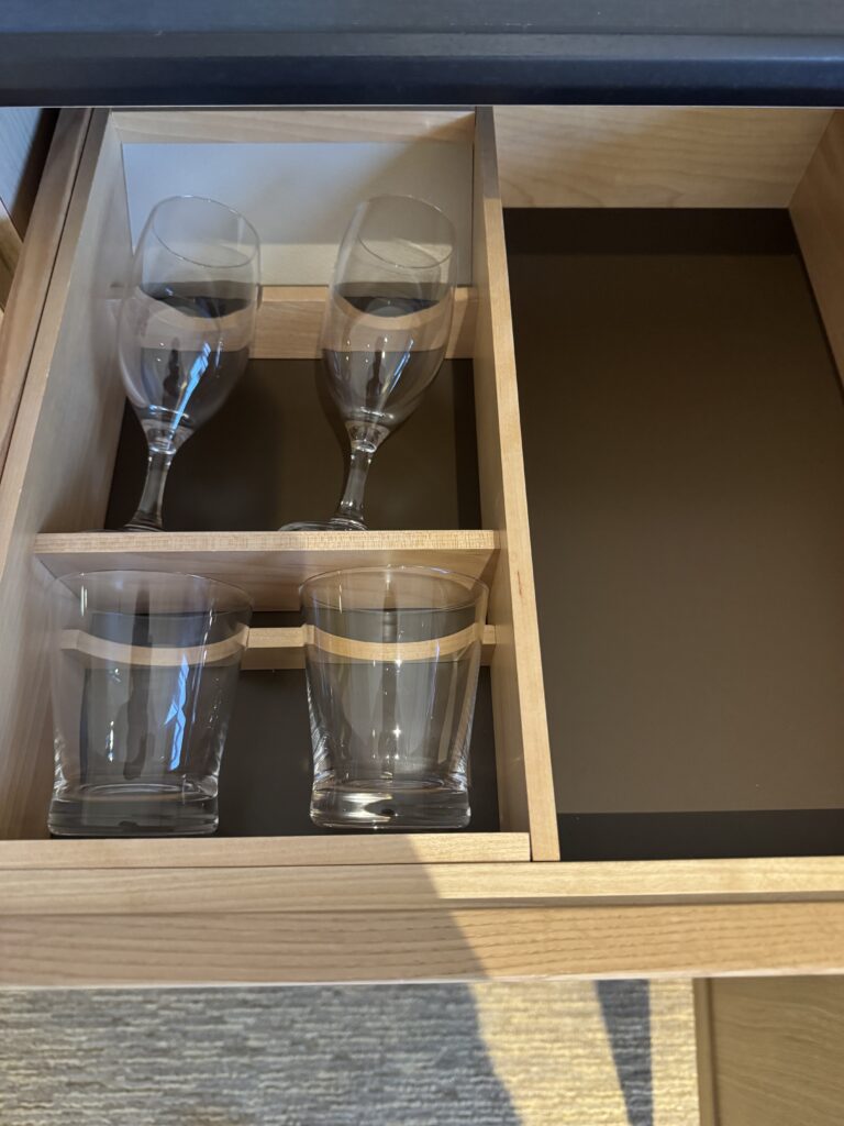 ホテルでお酒を飲むことが多いので、ワイングラスが用意されている点も高評価です。