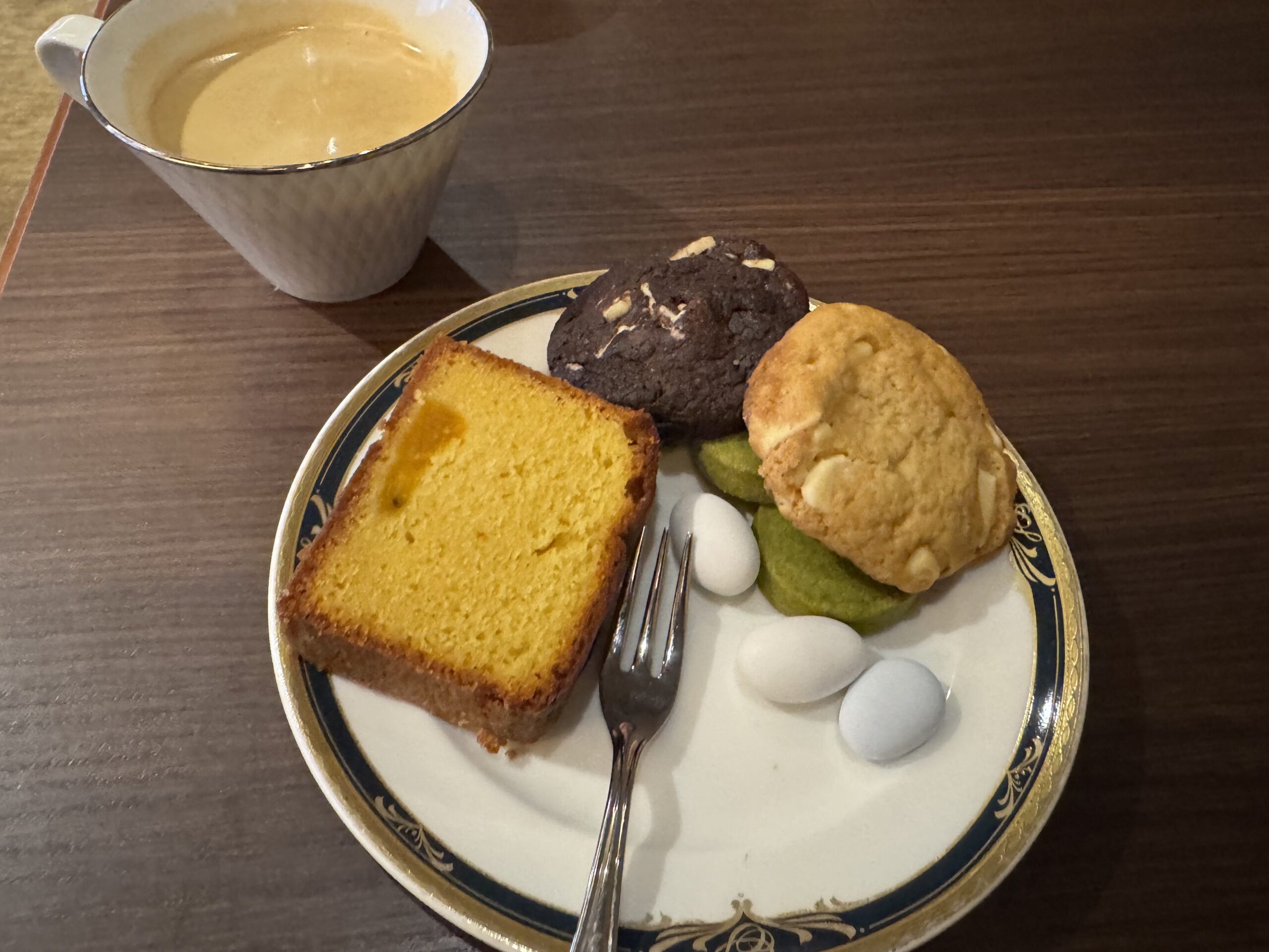 こちらはティーサービスの時間帯のお写真。クッキーやパウンドケーキ、お煎餅などのお菓子を自由に食べれます。